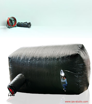 El día 20 de octubre, El País publicaba una noticia relacionada con la fotografía. Por 321 euros, se puede disponer de un plató hinchable de 10 x 6 x 6 metros con motor de aire incluido; o lo que es lo mismo, 60 m2 o 360 m3 de espacio interior. En lugar de un estudio permanente de fotografía, el espacio del plató hichable sólo existe cuando se necesita. El resto del tiempo, es un embalaje fácil de transportar que cabe en cualquier parte. Hubo un tiempo, en la década de 1960, en que visionarios como el grupo Archigram, imaginaban que la arquitectura para nuestra vida cotidiana podía ser hinchable y portátil; enchufable en cualquier parte (en nuevas estructuras concebidas ex profeso o sobre nuestras propias casas).
